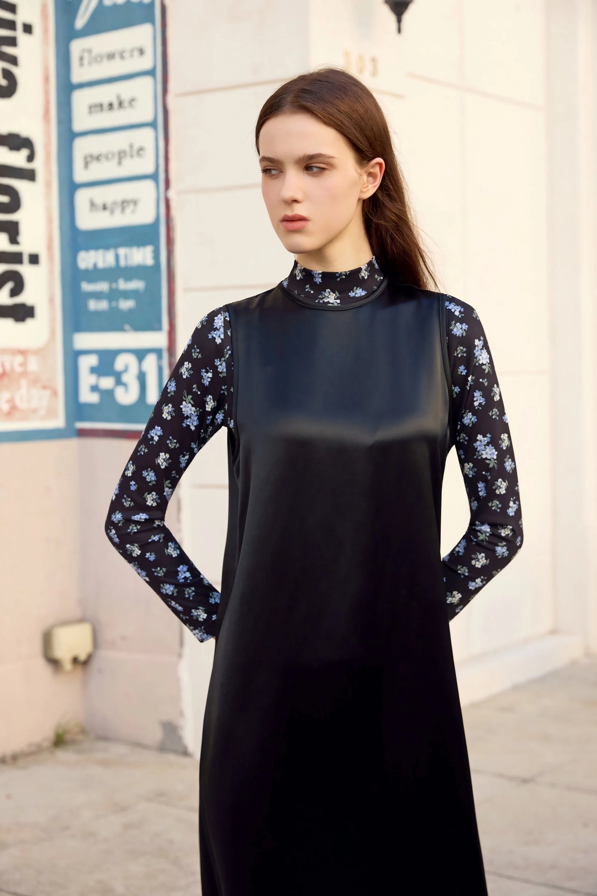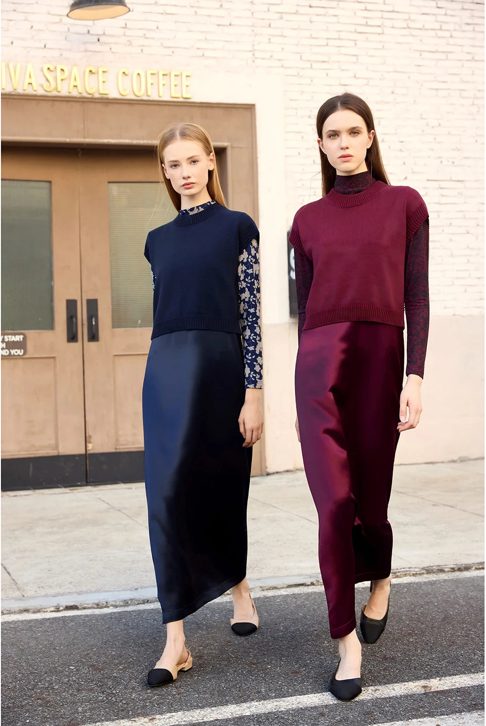 Printed Satin Maxi Dress Set – Mesh Inner Top + Knitted Vest (3-Piece Set)